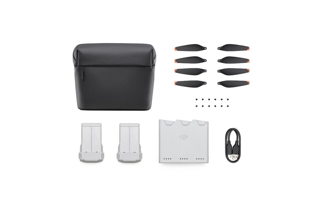 Das DJI Mini 3 Pro Fly More Set enthält zwei Intelligent Flight Batteries, eine Zwei-Wege-Ladestation, ein Datenkabel, eine Umhängetasche, Ersatzpropeller und Schrauben.